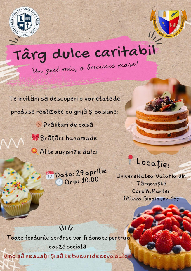 Pe 29 aprilie, la Universitatea Valahia din Târgoviște, va avea loc un târg caritabil unde vor fi expuse prăjituri de casă, brățări handmade și alte produse realizate cu grijă și pasiune.