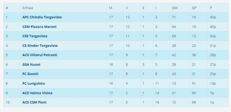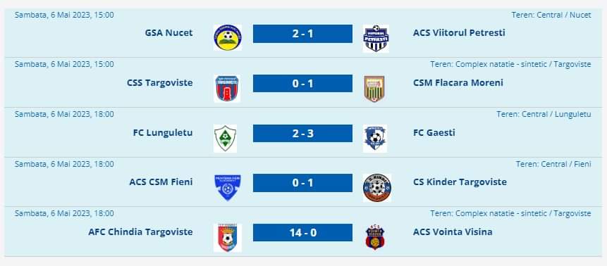 Oaspeții au fost superiori în ultima etapă, grație succeselor bifate de Flacăra Moreni, FC Găești și Kinder Târgoviște. Gazdele s-au impus prin GȘA Nucet și Chindia Târgoviște.