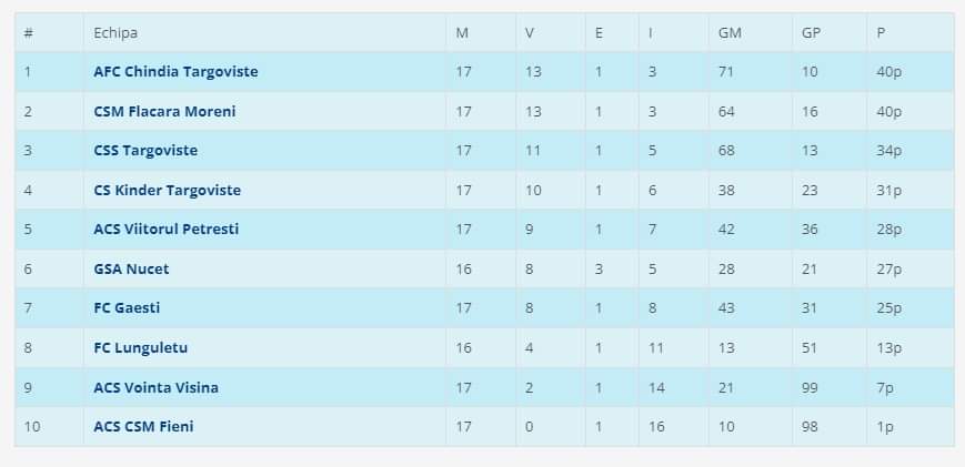 Chindia a preluat șefia seriei, grație golaverajului, însă mai are nevoie de o victorie vineri, în ultima etapă, la Moreni, dacă vrea să câștige această fază a competiției. Flacăra s-a impus în meciul tur și are două variante pentru a termina pe locul 1, victoria și egalul. Locul 3 este disputat de CSȘ și Kinder Târgoviște.