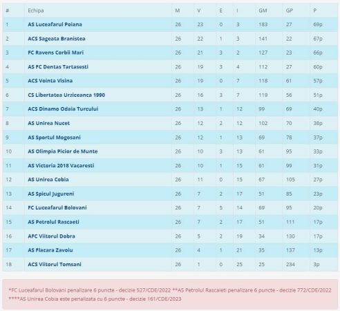 Poiana, Braniștea și Corbii Mari rămân pe podium, despărțite de numai trei puncte. Tărtășești ține relativ aproape și scoate Vișina din lupta pentru pozițiile de top.