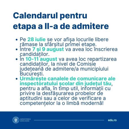 Pe 28 iulie se vor afișa locurile libere rămase la sfârșitul primei etape de admitere la liceu 2023. În cazul candidatilor care nu au fost repartizați urmează a doua etapă. Între 7 și 9 august va avea loc înscrierea candidaților. În 10-11 august va avea loc repartizarea candidaților, la nivel de Comisie județeană de admitere / a municipiului București.