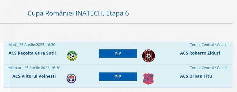 Viitorul Voinești , Urban Titu, Recolta Gura Șuții și Roberto Ziduri sunt cele patru echipe care au rămas în lupta pentru un trofeu mult râvnit: Cupa României INATECH, faza județeană. După tragerea la sorți a semifinalelor,  s-a stabilit și stadionul care va găzdui cele două jocuri, stadionul Găești, 25 aprilie, ora 16:30, Recolta Gura Șuții joacă cu Roberto Ziduri iar pe 26 aprilie, ora 16:30, Viitorul Voinești întâlnește pe  Urban Titu.
