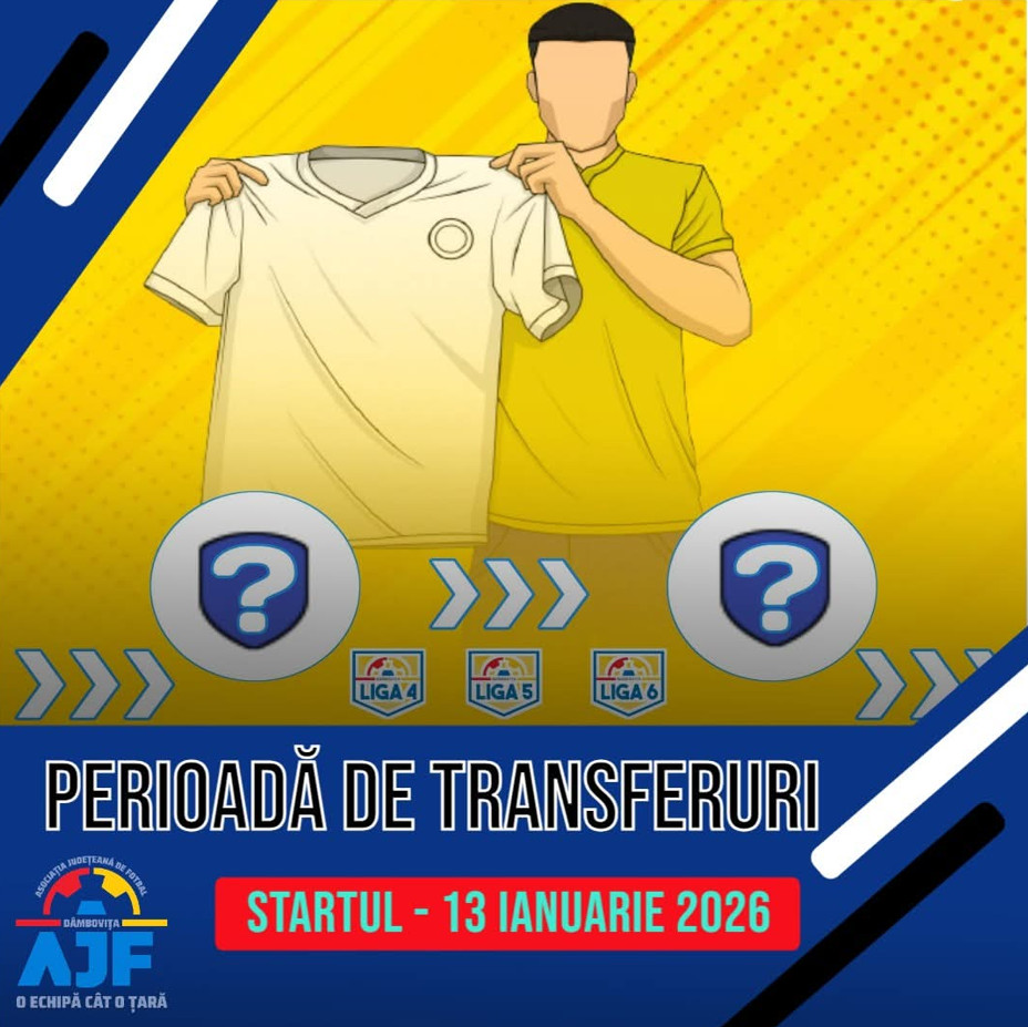 Asociația Județeană de Fotbal Dâmbovița anunță că perioada oficială de transferuri pentru iarna 2026 a început pe 13 ianuarie și este acum în derulare pentru toate ligile județene – Liga 4, Liga 5 și Liga 6.