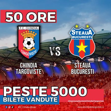 Peste 5000 de bilete au fost vândute pentru meciul Chindia Târgoviște- CSA Steaua București, potrivit informațiilor făcute publice de către conducerea Chindiei Târgoviște în cursul serii de sâmbătă.