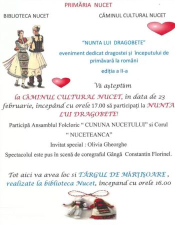 Primăria Nucet, Biblioteca Nucet și Caminul Cultural Nucet organizează Nunta lui Dragobete și Târgul de Mărțișoare, eveniment ajuns la cea-a dea doua ediție, dedicat iubirii și începutului de primăvară la români.