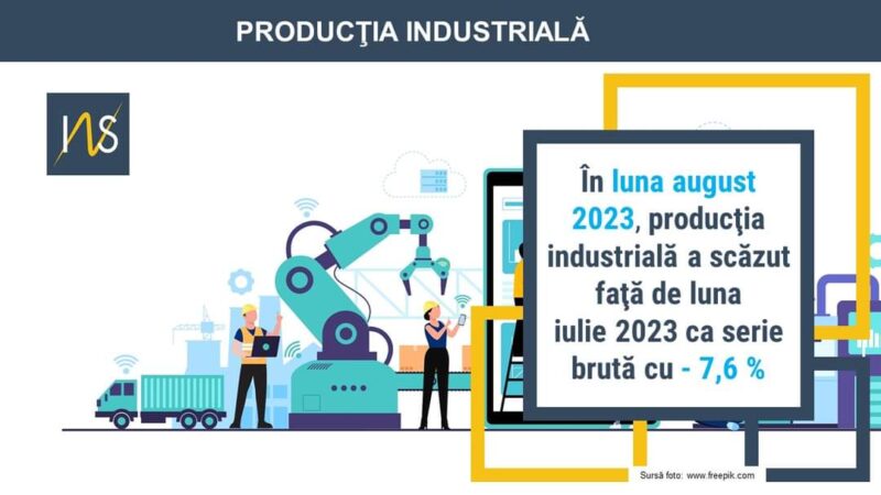 În luna august 2023, producția industrială, serie brută, a scăzut cu 5,8% comparativ cu aceeași lună din anul anterior.