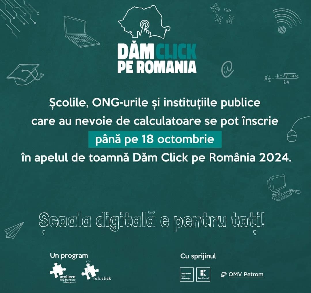 Pentru a beneficia de această inițiativă, școlile, ONG-urile și instituțiile publice sunt încurajate să aplice până pe 18 octombrie prin completarea unui formular disponibil pe www.educlick.ro. Proiectele înscrise vor fi evaluate iar laureații vor fi anunțați pe 25 octombrie.