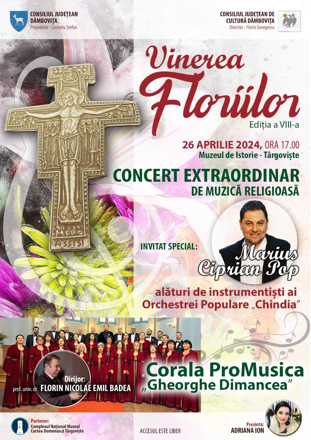 Anul acesta, publicul dâmbovițean va avea bucuria de a-l întâlni, pentru prima dată la Târgoviște, pe renumitul interpret de folclor Marius Ciprian Pop. Personalitate multiplă, solist de muzică populară, dar și preot, se va prezenta în fața iubitorilor de folclor într-o altă ipostază: interpretând pricesne. Repertoriul abordat va fi compus din piese reprezentative ale folclorului religios, care vor urma cronologia faptelor, precum și a emoțiilor legate de ultima săptămână din viața lui Iisus Hristos (Săptămâna Patimilor) – Intrarea în Ierusalim, Cina cea de Taină, Răstignirea și Învierea. Alături de el se vor afla instrumentiști ai Orchestrei Populare „Chindia”.