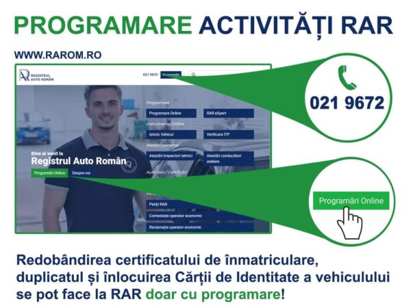 RAR informează că începând cu data de 15 noiembrie 2023, verificările necesare pentru redobândirea Certificatului de Înmatriculare reținut la controlul tehnic în trafic, eliberarea duplicatul și înlocuirea Cărții de identitate, vor necesita programare prealabilă.
