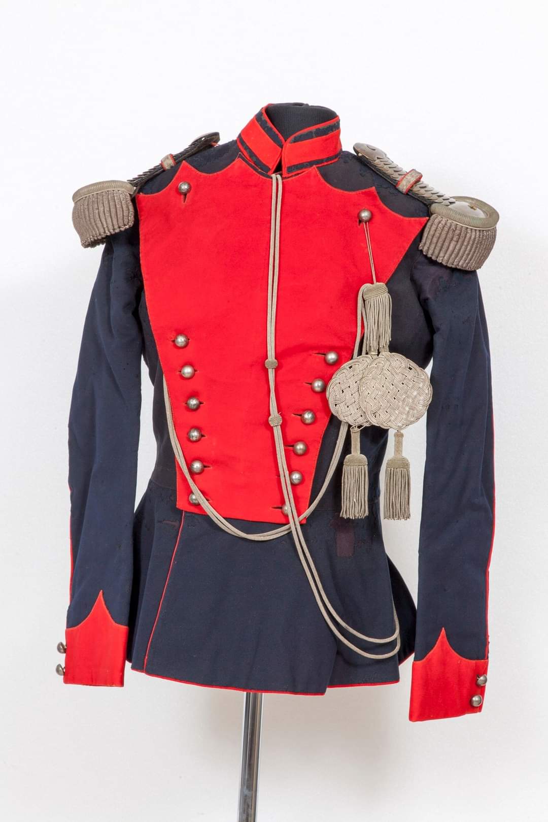 Este confecţionată din stofă bleumarin, cu plaston roşu fixat pe două rânduri, cu câte şapte nasturi aurii. Manşetele, din postav roşu, au câte doi nasturi aurii. Epoleţii sunt bordaţi cu fir argintiu, cu o stea în centru. Fungierea din fir auriu are trei ciucuri la capăt.