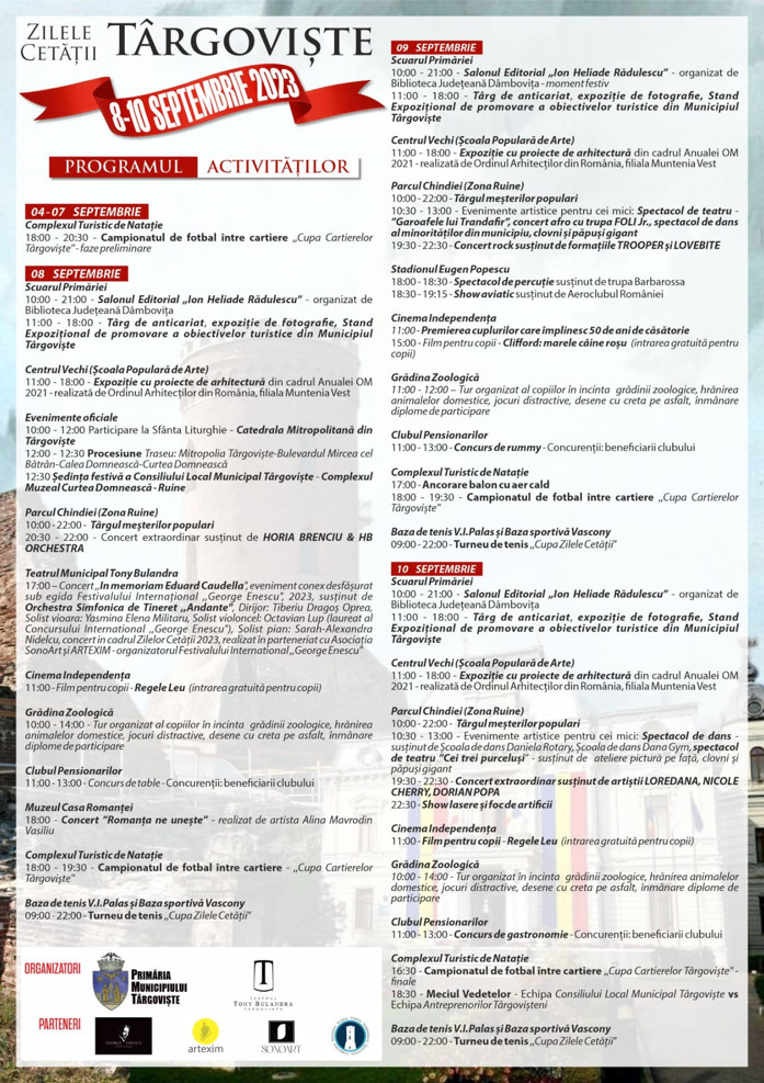 Se fac pregătiri pentru Zilele Cetății  Târgoviște, s-a pregătit un program care să răspundă tuturor exigențelor  în cele 3 zile, 8-10 septembrie, dedicate sărbătorii, un program care să-i bucure pe copii și seniori deopotrivă, pe cei care iubesc sportul, pe cei pasionați de carte, pe cei care vor să se distreze la concerte de calitate, pe cei care tânjesc după obiecte tradiționale și obiceiuri meșteșugărești etc. Vom avea o sărbătoare care înseamnă mai mult decât o „petrecere în aer liber”.