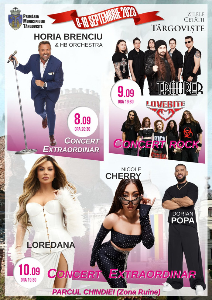 Și concertele, în cele 3 zile îi vom avea la Târgoviște pe Horia Brenciu și HB Orchestra, pe Trooper și Lovebite, pe Loredana, Nicole Cherri și Dorian Popa. Cum spuneam, pentru toate exigențele.