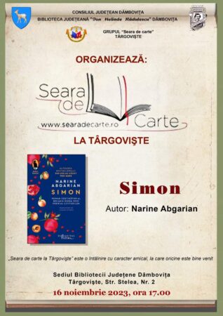 Un secol de istorie armeană, văzut prin prisma femeilor dintr-un orășel de munte, se desfășoară în Simon, noul bestseller internațional al scriitoarei Narine Abgarian. Simon ne atrage intr-un vârtej de povești, în care duritatea vieții se însemnează cu delicatețea iubirii, iar tragicul și sumbrul se împletesc cu umorul și exuberanța.„Seara de carte la Târgovişte” este o întâlnire cu caracter amical, la care oricine este bine venit.