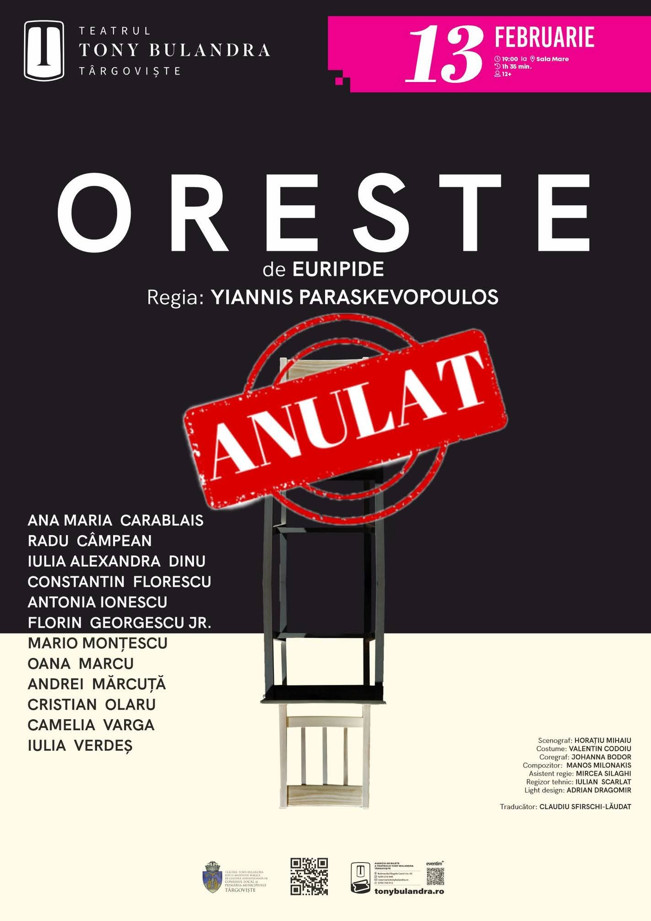 Teatrul Tony Bulandra Târgoviște anunță că reprezentația spectacolului „Oreste”, programată pentru 13 februarie 2026, va fi suspendată și reprogramată pentru o dată ulterioară, din motive obiective, independente de voința organizatorilor.