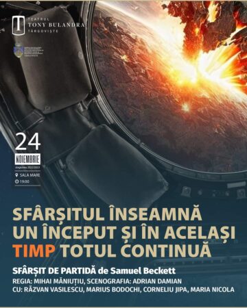 Așadar, vă invităm să urmărim spectacol „Sfârșit de partidă” de Samuel Beckett, regia:Mihai Mănuțiu, traducerea: Ștefana Pop-Curșeu și Irina Mavrodin, scenografia: Adrian Damian, sound design: Mihai Dobre, în distribuție:Răzvan Vasilescu , Marius Bodochi, Corneliu Jipa, Maria Nicola