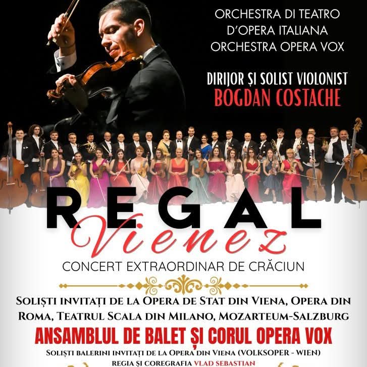 Regal Vienez – Spectacol Extraordinar de Crăciun pe 29 decembrie, ora 20:00, iubitorii muzicii clasice vor fi răsfățați de un concert de excepție care marchează 200 de ani de la nașterea lui Johann Strauss, într-un regal muzical de Crăciun, cu orchestră, dans și eleganță vieneză.