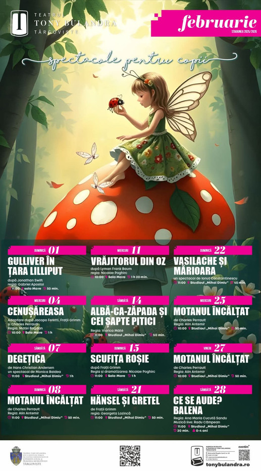 14 februarie – Albă-ca-Zăpada și cei șapte pitici, regia Viorica Máté, ora 11:00, Studioul „Mihai Dimiu” (50 min). O poveste clasică reinterpretată cu farmec și umor pentru cei mai tineri spectatori.