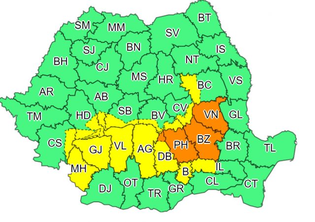 În județele Prahova, Buzău, Vrancea și în zona montană din județul Dâmbovița vor fi precipitații abundente, iar prin acumulare, pe tot parcursul intervalului, se vor înregistra cantități de precipitații în general de peste 50…60 l/mp.