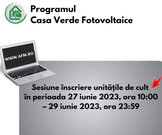 Administrația Fondului pentru Mediu demarează sesiunea de finanțare pentru înscrierea solicitanților persoane fizice în cadrul Programului privind instalarea sistemelor de panouri fotovoltaice pentru producerea de energie electrică, în vederea acoperirii necesarului de consum și livrării surplusului în rețeaua națională, începând cu data de 19 mai 2023, ora 10:00 și până la data de 26 iunie 2023, ora 23:59, prin intermediul aplicației informatice pusă la dispoziție pe site-ul www.afm.ro, în vederea introducerii informațiilor necesare participării în Program. De asemenea, unitățile de cult se vor putea înscrie în program în perioada 27 iunie 2023 , ora 10:00 – 29 iunie 2023 , ora 23:59.