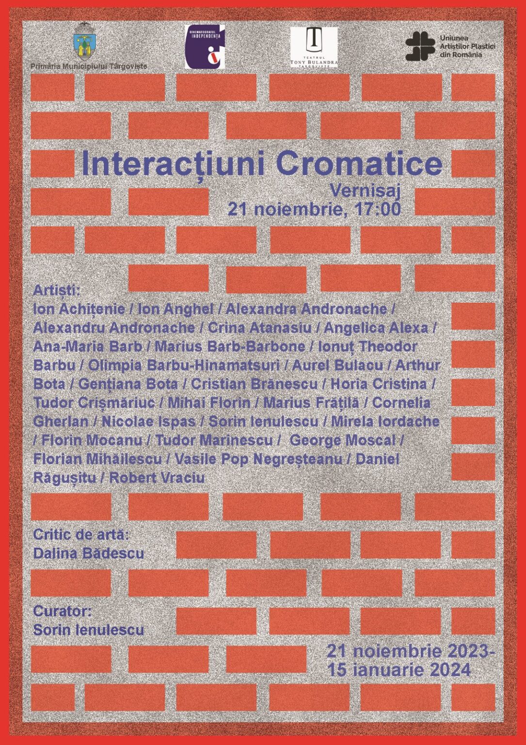 Primăria Municipiului Târgovişte şi Teatrul Tony Bulandra vă invită la deschiderea oficială a expoziţiei de pictură „Interacțiuni cromatice” a unui grup amplu de artiști din toate generațiile, membri ai Uniunii Artiștilor Plastici din România.