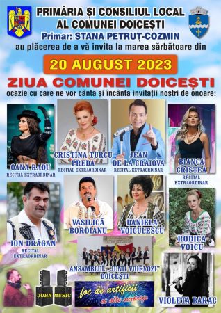 Pe scenă vor urca interpreți de renume precum Oana Radu, Cristina Turcu Preda, Bianca Cristea, Jean de la Craiova, Ion Drăgan, Vasilică Bordianu, Daniela Voiculescu, Rodica Voicu, Violeta Barac, Ansamblul ” Junii Voievozi” Doicești și John Music. „Primăria și Consiliul Local al Comunei Doicești, au deosebita plăcere de a vă invita la manifestările dedicate Zilei Comunei Doicești care vor avea loc duminică, 20 august, începând cu ora 14:45 , în Parcul Mateiaș. Vă mulțumim și vă așteptăm cu drag”, a transmis primarul Cosmin Stana