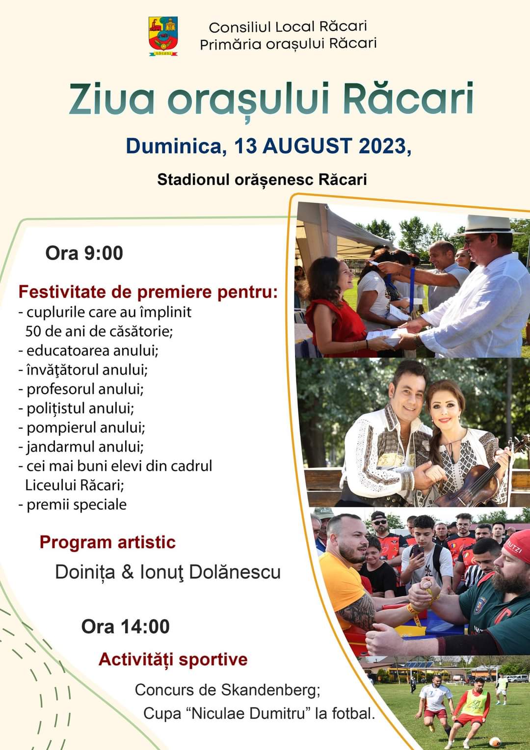 Pe stadionul orașului Răcari va avea loc, începând cu ora 9:00, Festivitatea de premiere pentru :cuplurile care au împlinit 50 de ani de căsătorie;educatoarea anului; învăţătorul anului; profesorul anului; polițistul anului; pompierul anului; jandarmul anului; cei mai buni elevi din cadrul Liceului Răcari și premii speciale.